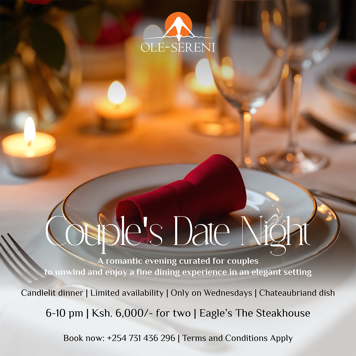 Celebrate Valentine’s with an intimate dining experience at Eagle’s The Steakhouse and enjoy our house specials, candlelit ambience and thoughtful romantic touches designed to make the night unforgettable. To reserve a table, call +254 731 436296. #OleSereni #LoveAndWild #EaglesNest