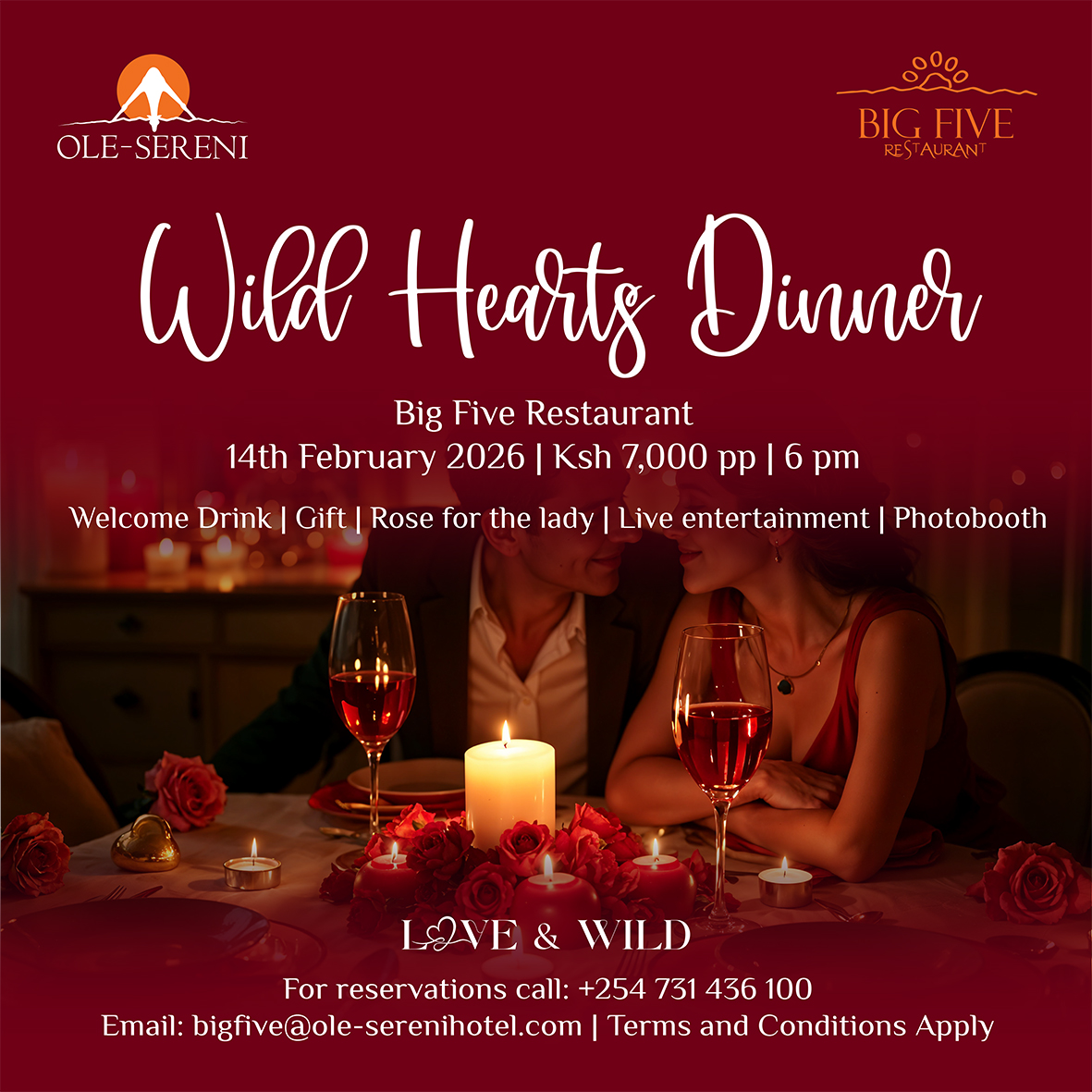 For hearts that love boldly! The Wild Hearts Dinner at Big Five Restaurant brings together great food, live entertainment, and a warm, romantic setting for an unforgettable Valentine’s night. To reserve a table, call +254 731 436100. #OleSereni #WildHeartsDinner #LoveAndWild